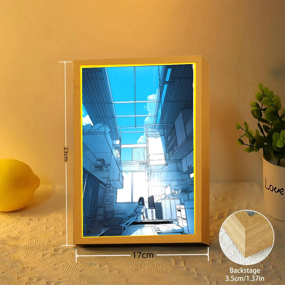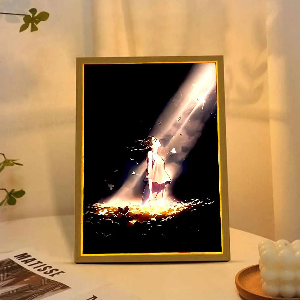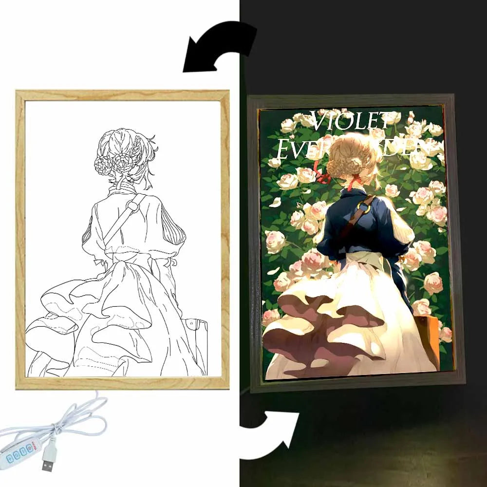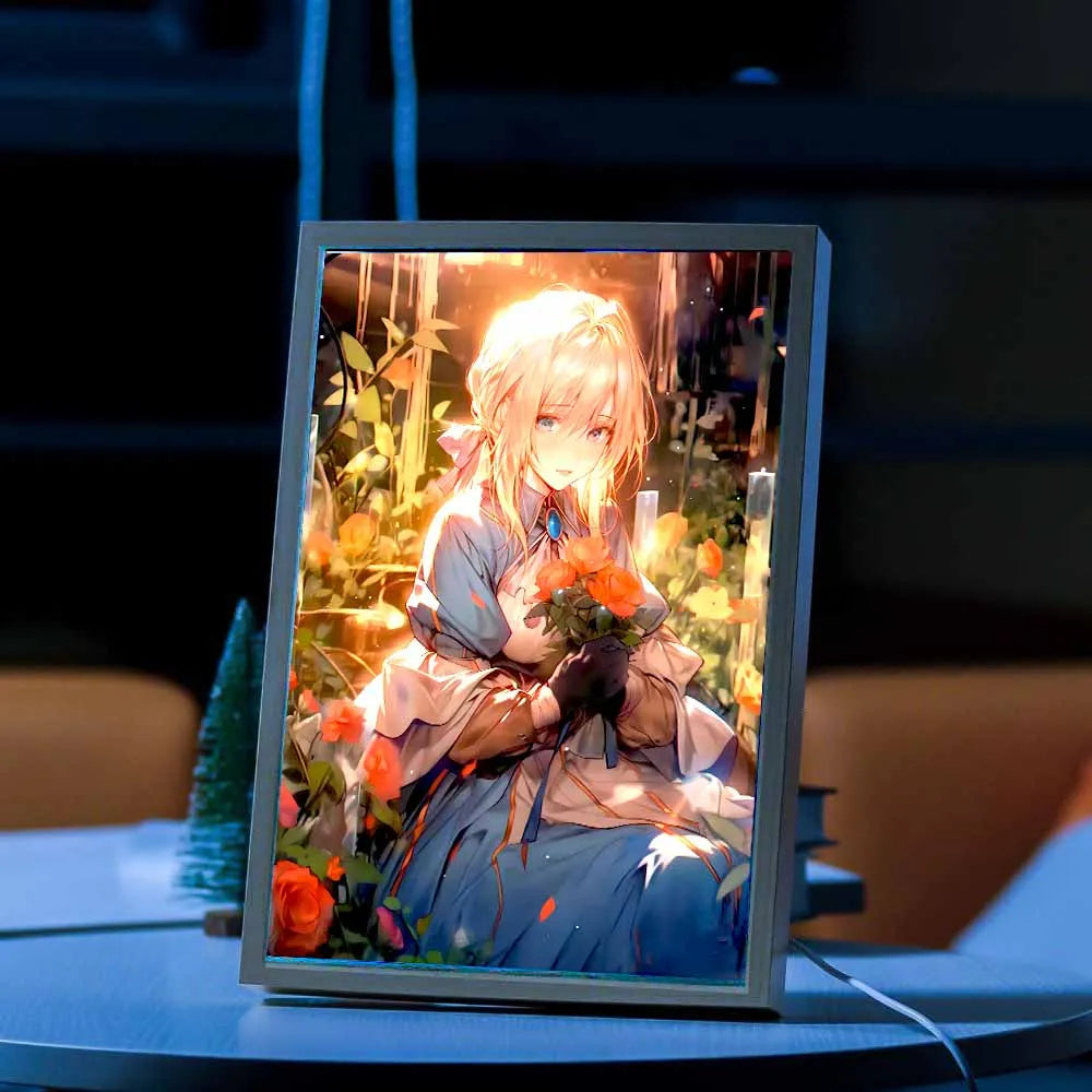The artwork is displayed within a sleek frame and illuminated with soft LED lighting, creating a warm glow that highlights every delicate detail of the illustration. Whether it features Violet in her signature outfit, serene poses, or emotional moments from the series, the light enhances the artwork beautifully, making it stand out both during the day and at night. It’s perfect for bedrooms, desks, shelves, or anime-themed corners where you want a calm, elegant vibe.