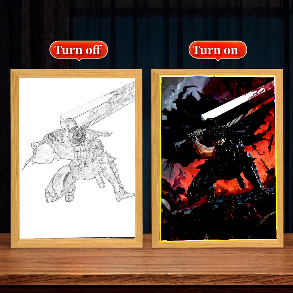 Bring the dark, powerful world of Berserk into your room with this 3D LED Light Painting Frame — a striking display piece designed for fans who want bold artwork, atmosphere, and dramatic décor. Featuring sharp, high-detail illustrations inspired by Berserk, this illuminated frame captures the grit, intensity, and emotion of the series. Whether it showcases Guts in Berserker Armour, the Brand of Sacrifice, or iconic silhouettes, the lighting effect makes every detail stand out beautifully.