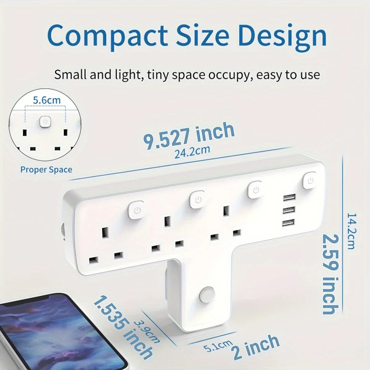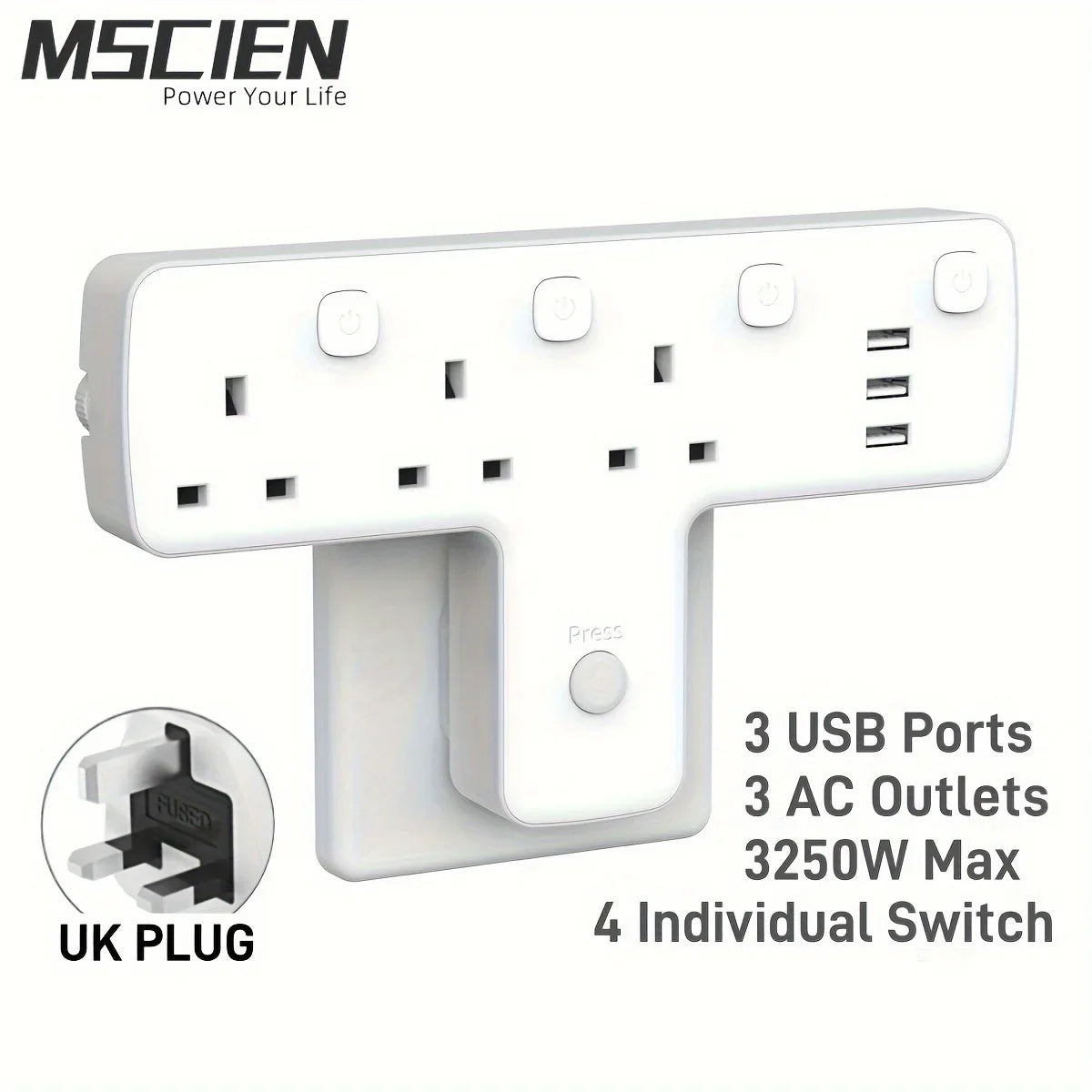 Upgrade your home or office setup with this versatile 3-Way UK Plug Adapter featuring 3 USB ports and individual on/off switches with indicator lights. Say goodbye to bulky extension cords – this compact unit provides reliable, convenient charging for multiple devices at once.